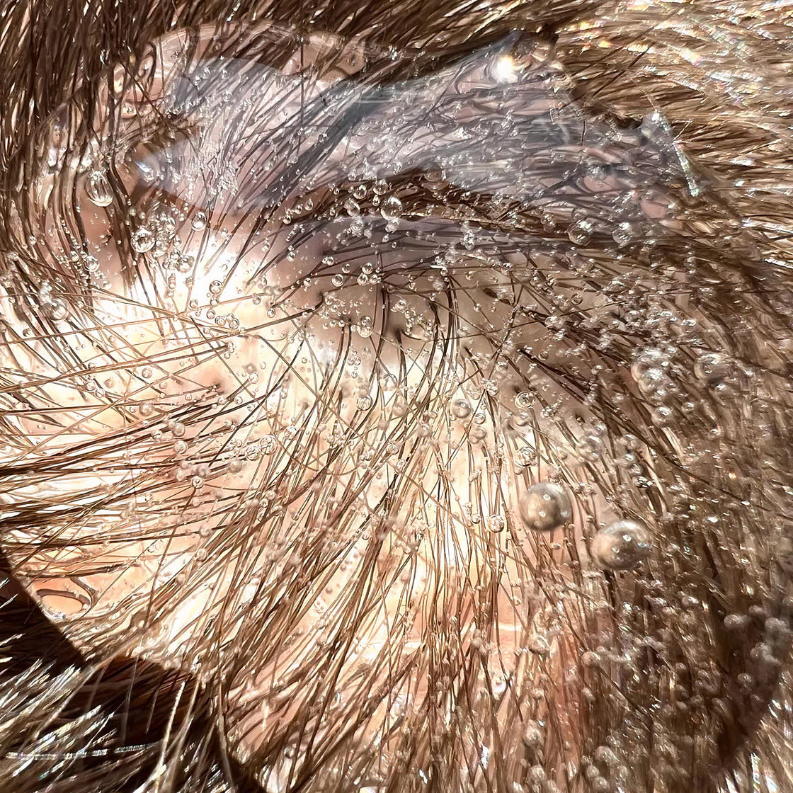 Mittellanges/langes Haar: Kein Risiko für die Wirksamkeit, aber trenne die Strähnen ab, damit die Mikronadeln und das Serum die Haut gut erreichen können.